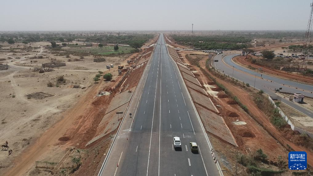 这张2024年3月17日在塞内加尔姆布尔市郊拍摄的资料照片显示的是中国路桥工程有限责任公司承建的姆布尔-考拉克高速公路项目附属工程施工现场(无人机照片)。新华社发(中国路桥工程有限责任公司供图)