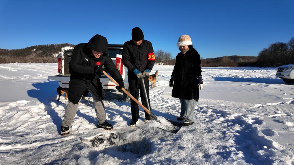 阿巴河的冰面上,记者(左一)与孙金河、刘兰香一起凿冰取水。新华社记者 张晟 摄