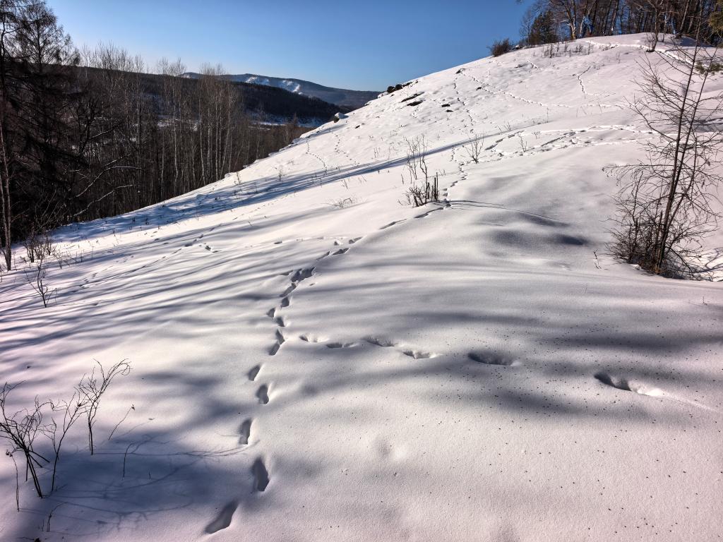 这是野生动物在山坡雪地上留下的蹄印。新华社记者 恩浩 摄