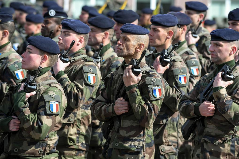 2017年4月20日,在爱沙尼亚北部塔帕陆军基地,法国士兵出席阅兵仪式。新华社发(谢尔盖·斯捷潘诺夫摄)