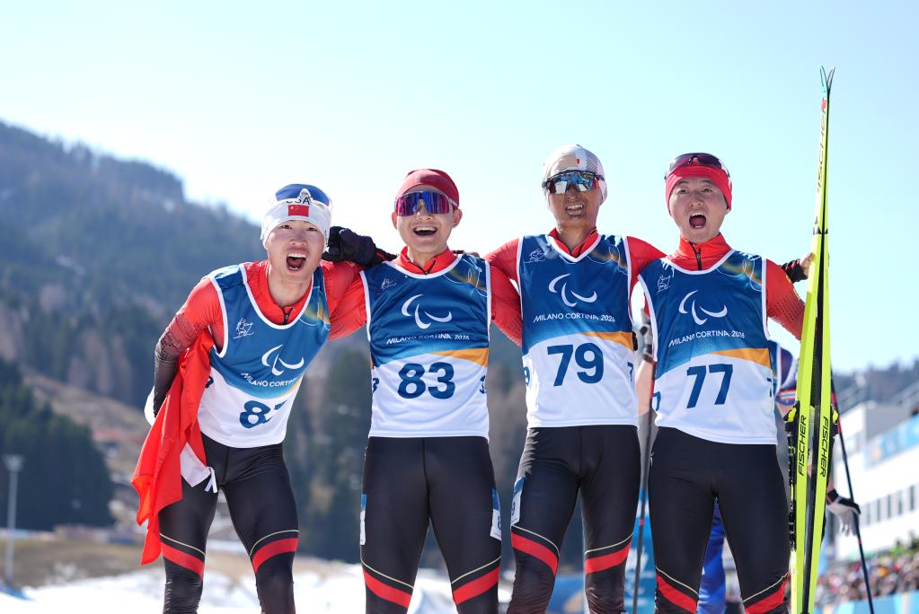 3月7日,中国选手刘晓彬、蔡佳云、吴君宝和袁明寿(从左至右)在比赛后合影。新华社记者 侯昭康 摄