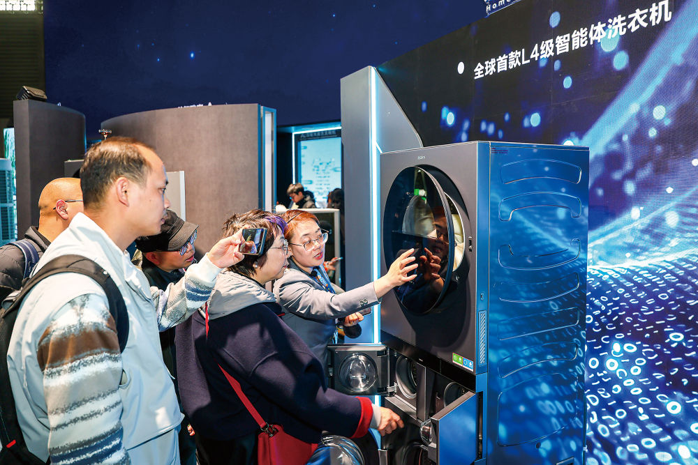 3月12日,参观者在了解一款L4级智能洗衣机。当日,2026中国家电及消费电子博览会(AWE 2026)在上海开幕。本届展览以“AI科技 慧享未来”为主题,首次启用“一展双区”创新模式,总展览面积达17万平方米,吸引超过1200家国内外企业参展。新华社记者王翔摄