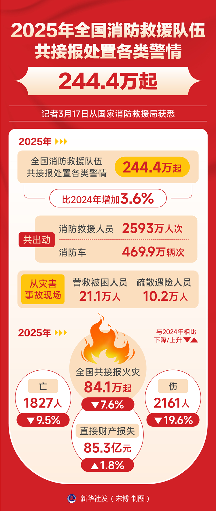 新华社北京3月17日电(记者黄韬铭)记者17日从国家消防救援局获悉,2025年全国消防救援队伍共接报处置各类警情244.4万起,比2024年增加3.6%,共出动消防救援人员2593万人次、消防车469.9万辆次,从灾害事故现场营救被困人员21.1万人,疏散遇险人员10.2万人。