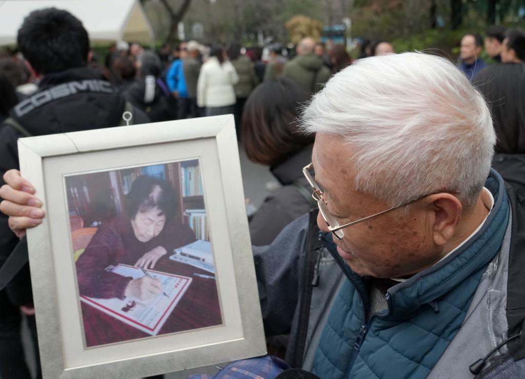 3月18日,一位市民捧着于漪老师的照片前来送别。 新华社记者 刘颖 摄