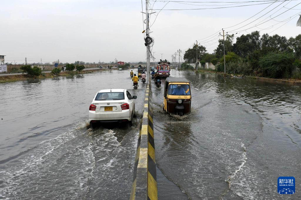 3月19日,在巴基斯坦南部城市卡拉奇,车辆在积水的路面上行驶。新华社发