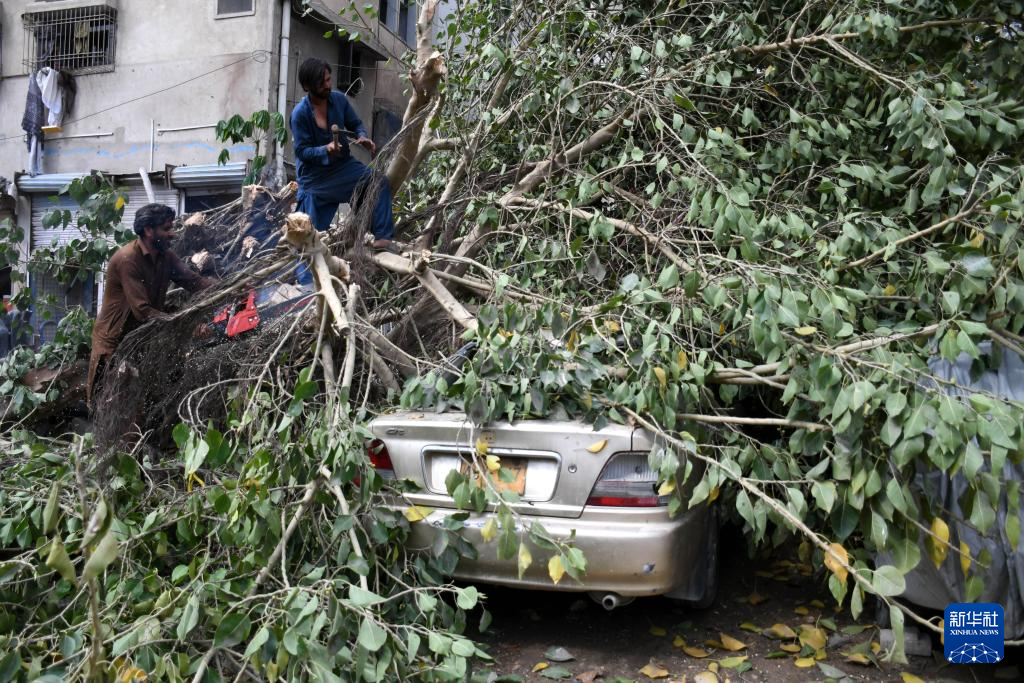 3月19日,在巴基斯坦南部城市卡拉奇,工人砍伐倒伏在汽车上的树木。新华社发