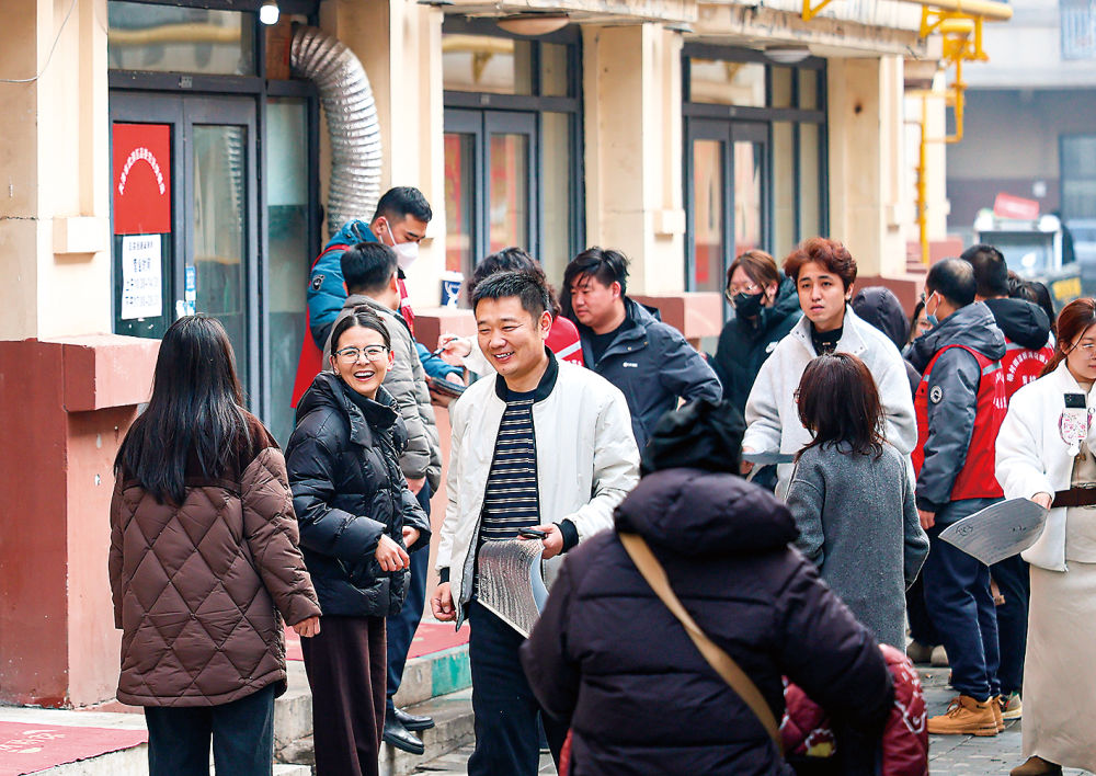 赵磊的小店门前,排到号的顾客喜笑颜开(3月3日摄)。新华社记者李然摄