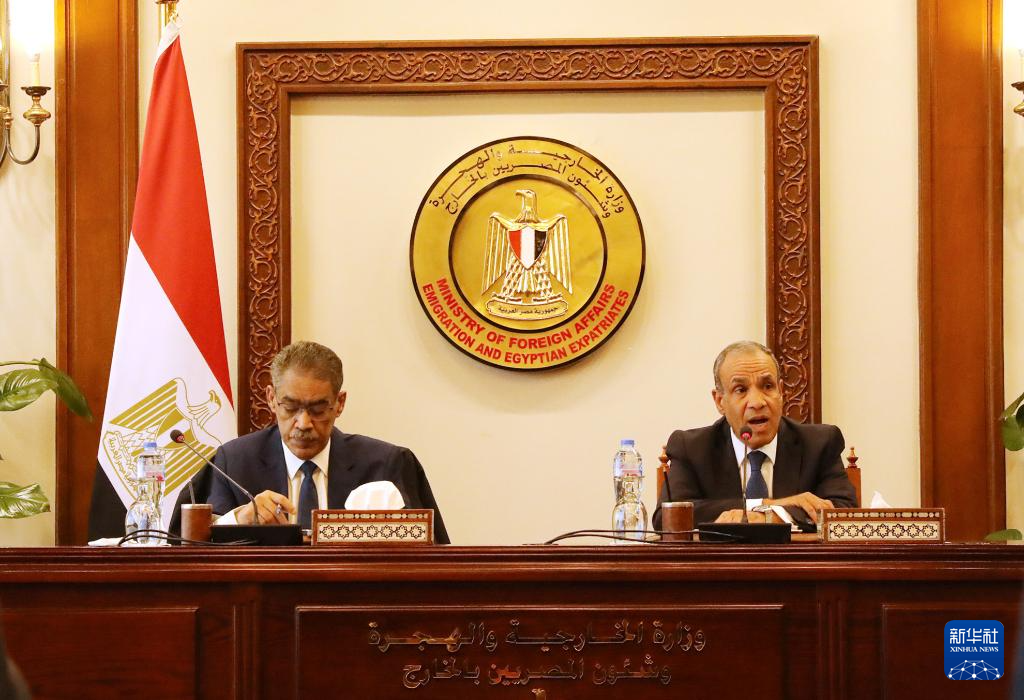 3月25日,埃及外长阿卜杜勒阿提(右)在新行政首都对媒体讲话。新华社记者 徐皓夫 摄