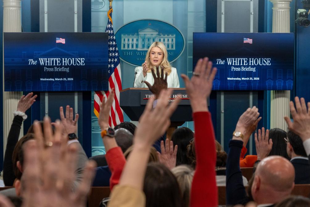 3月25日,在美国首都华盛顿白宫,白宫新闻秘书莱维特出席记者会。新华社发(李源清摄)