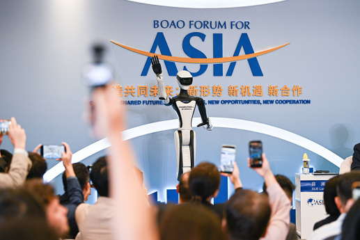 3月25日在博鳌亚洲论坛“人形机器人的进阶与飞跃”分论坛上拍摄的机器人。新华社记者 蒲晓旭 摄