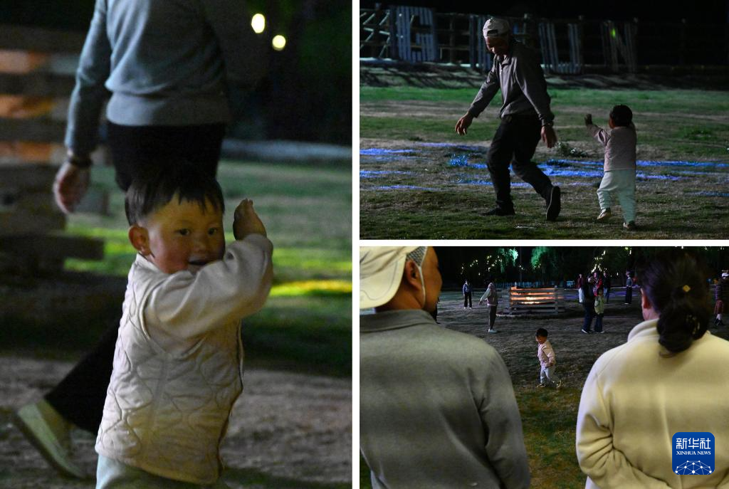 3月26日晚,东村一名两岁女孩在父母陪伴下参加打跳(拼版照片)。