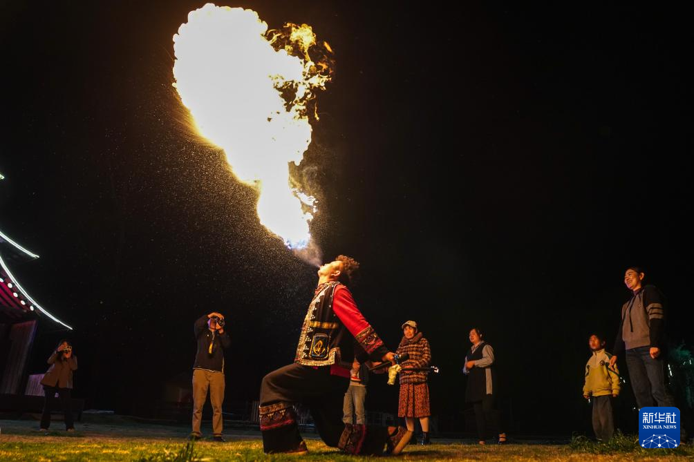 3月26日,在东村社区,一名演员为人们表演“喷火”。