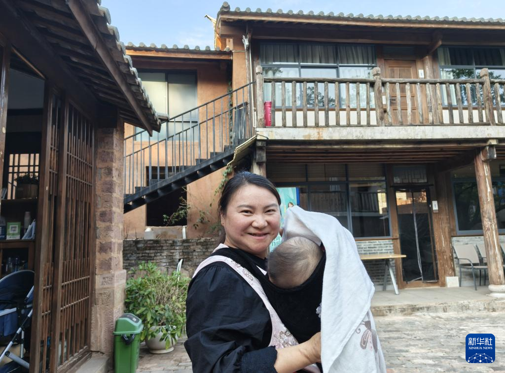 3月26日,在东村社区“虹风小院”,从寻甸县嫁到东村的蒋梅抱着孩子接受记者采访说:“我原来在寻甸县城做买卖,生意不好就退出了,现在在家门口上班有一份收入,还能照顾孩子,挺好。”