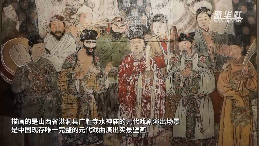 在山西博物院,有一幅斑驳却色彩鲜明的元代壁画,描画的是山西省洪洞县广胜寺水神庙的元代戏剧演出场景,是中国现存唯一完整的元代戏曲演出实景壁画。