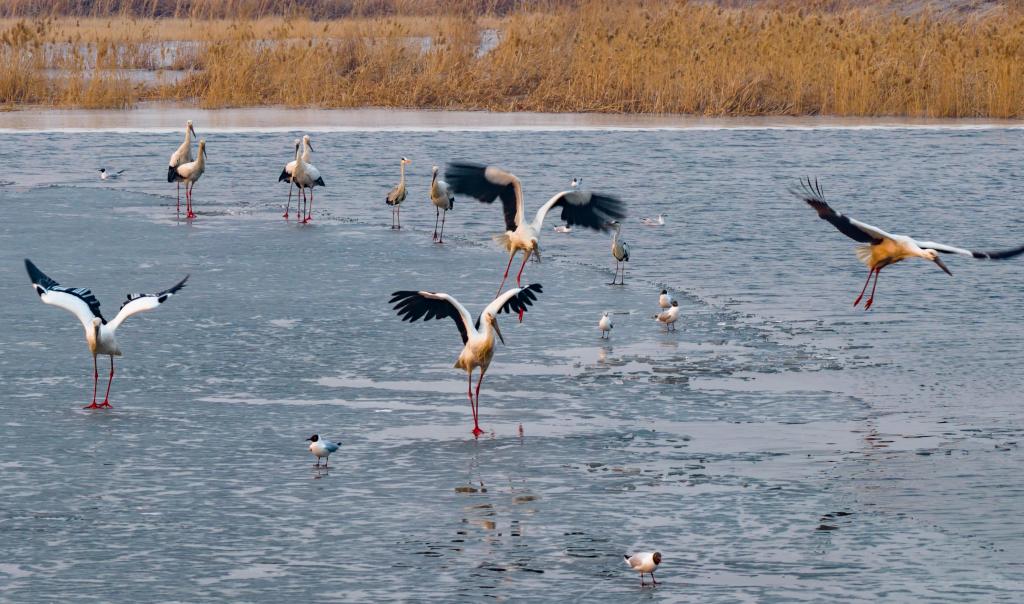 3月19日,一群东方白鹳在松花江哈尔滨段一处水域觅食(无人机照片)。新华社发(张树 摄)