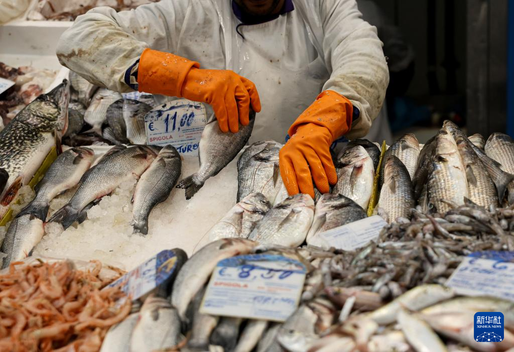3月31日,在意大利罗马一处菜市场,售货员在摆放海鲜。新华社记者 李京 摄