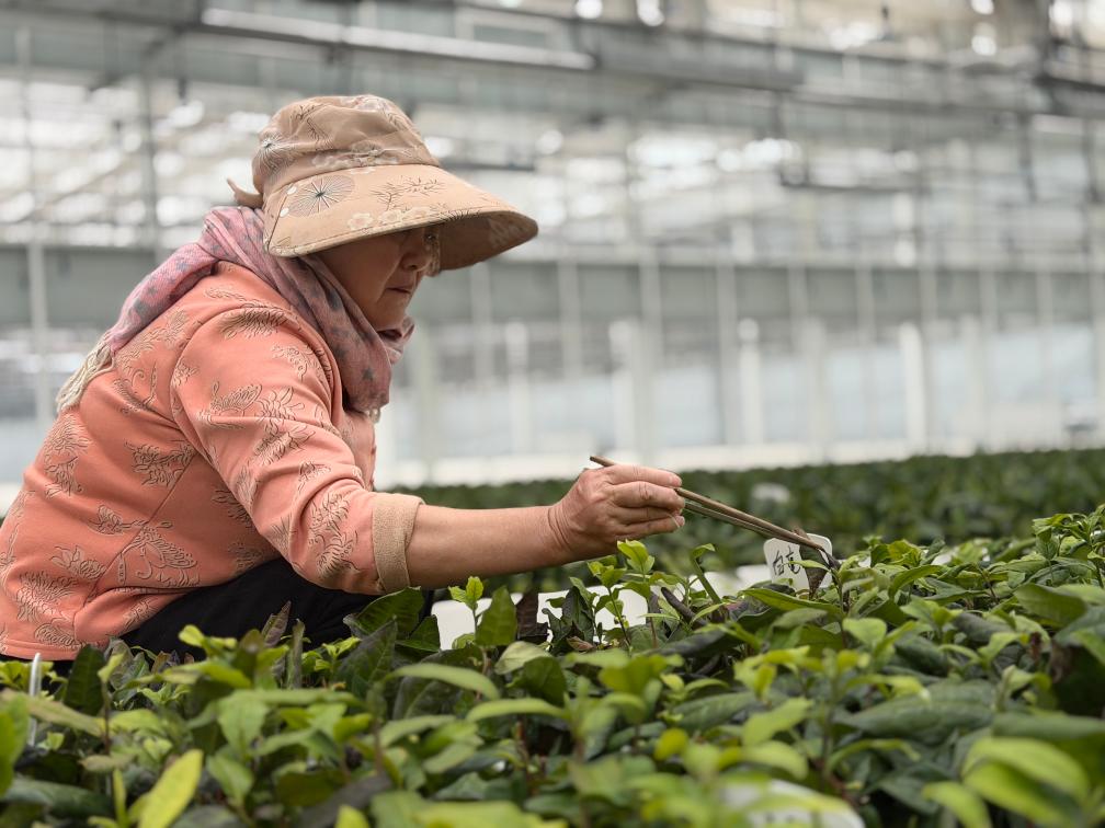 日照茶叶科创示范园,村民用筷子挑出茶苗中的落叶。新华社记者张钟仁 摄