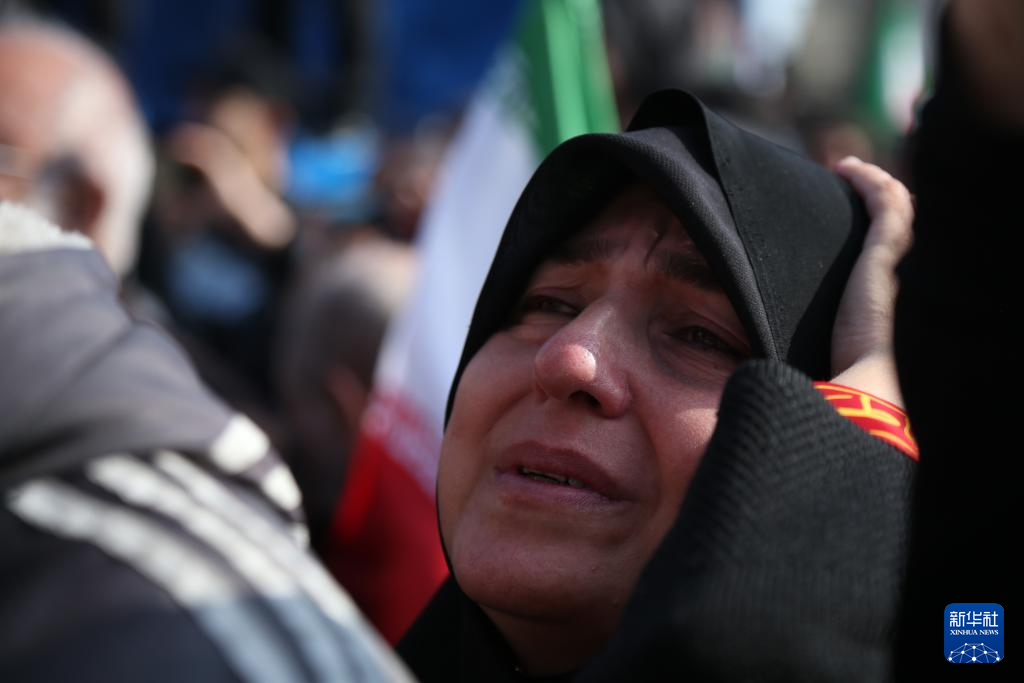4月1日,在伊朗首都德黑兰革命广场,民众参加为伊朗伊斯兰革命卫队海军司令坦格西里、伊朗武装部队总参谋长顾问贾姆希德·埃哈基及伊朗武装部队军事人员举行的告别仪式时情绪激动。新华社记者 沙达提 摄