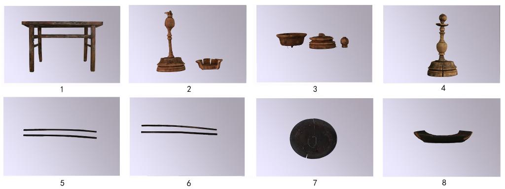 该墓葬共出土随葬品50件(套),以木质器具为主,还包括少量瓷器、铜器、纺织品等。其中,最引人注目的是木质供桌上摆放着3个烛台、2双箸、2件盘、1把梳、1个奁盒和2个瓷杯,再现了400多年前古人的生活场景。