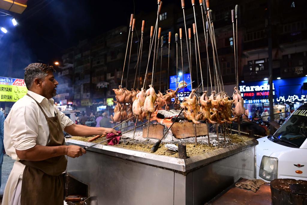 3月27日,在巴基斯坦南部城市卡拉奇,一家餐厅的厨师制作烤鸡。新华社发