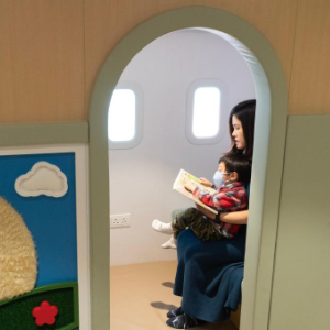 在位于香港国际机场一号客运大楼的“感知阁”内,邓女士陪伴被诊断为孤独症的儿子阅读搭乘飞机的绘本(3月31日摄)。 新华社发(龙镜伊 摄)