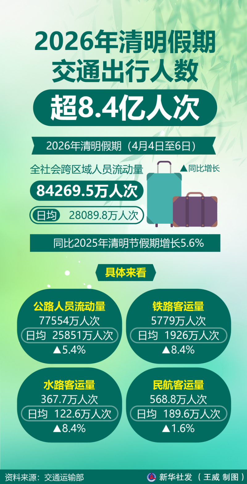 新华社北京4月7日电(记者叶昊鸣)记者7日从交通运输部获悉,今年清明假期(4月4日至6日),全社会跨区域人员流动量为84269.5万人次,日均为28089.8万人次,同比2025年清明节假期增长5.6%。