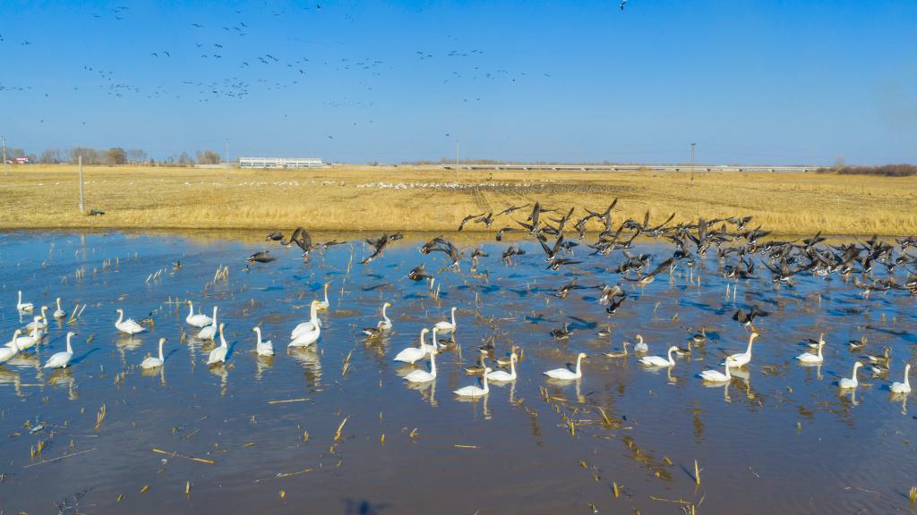 候鸟在西辽河上觅食。新华社发(王金 摄)