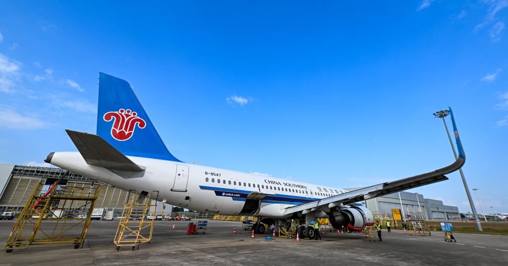 1月29日,海口美兰国际机场停机坪上,南航工程技术分公司机务工程师在对飞机进行深度检查。新华社记者 杨冠宇 摄
