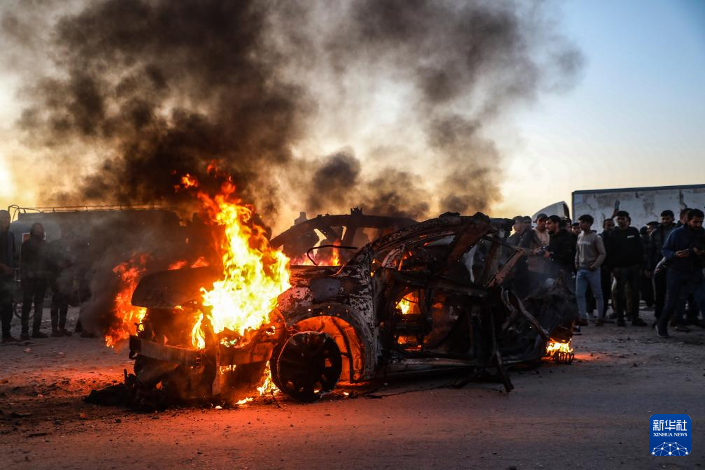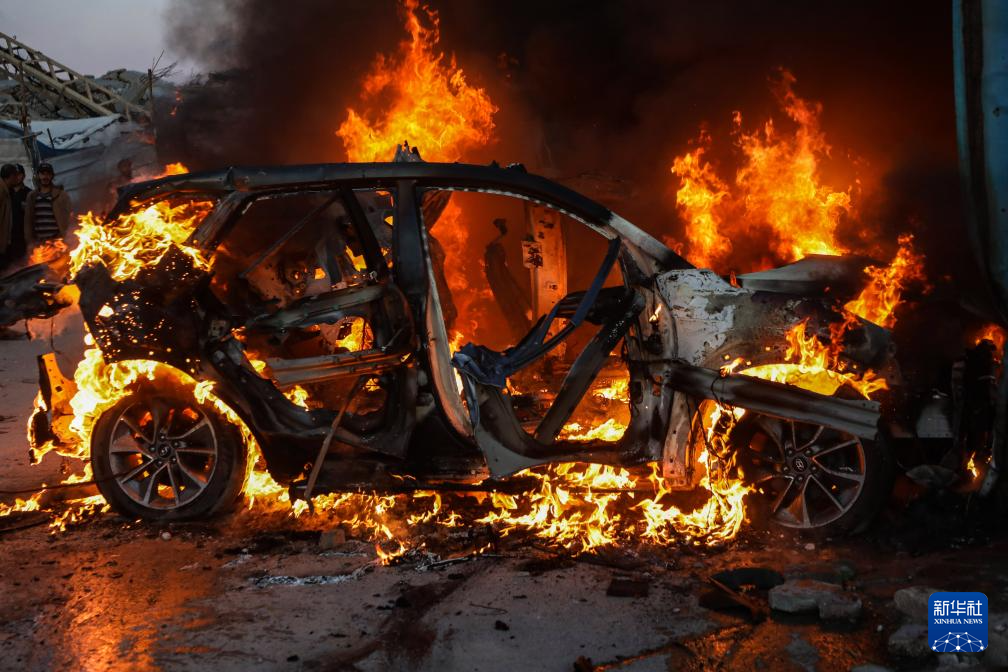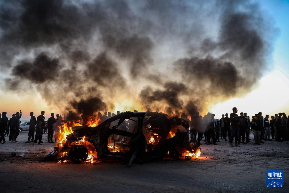 这是4月8日在加沙城拍摄的遭以军空袭后起火的车辆,车内一名半岛电视台记者遇难。新华社发(里泽克·阿卜杜勒贾瓦德摄)