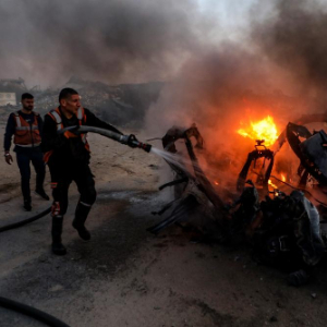 4月8日,救援人员在加沙城为遭以军空袭的汽车灭火,车内一名半岛电视台记者遇难。新华社发(里泽克·阿卜杜勒贾瓦德摄)