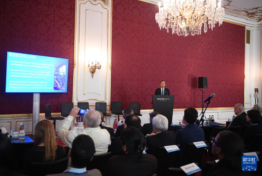 4月9日,在奥地利维也纳,全球能源互联网发展合作组织主席、中国电力企业联合会理事长辛保安在主题为“能源转型能力建设与标准创新”的边会上致辞。新华社记者 贺灿铃 摄