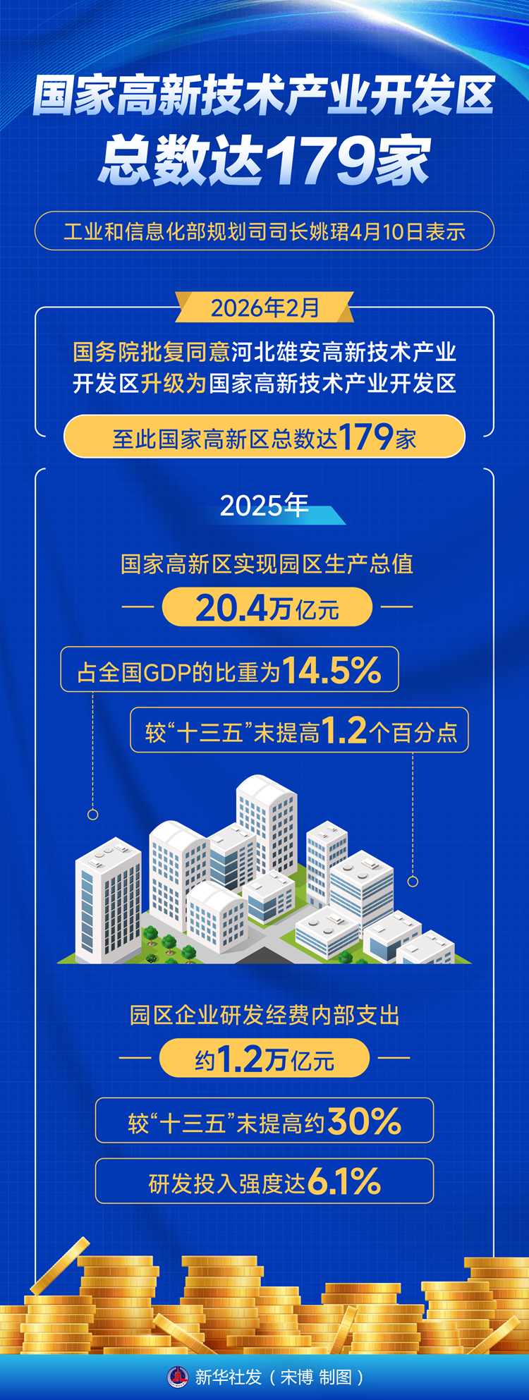新华社北京4月10日电(记者周圆)工业和信息化部规划司司长姚珺10日表示,今年2月,国务院批复同意河北雄安高新技术产业开发区升级为国家高新技术产业开发区,至此国家高新区总数达179家。