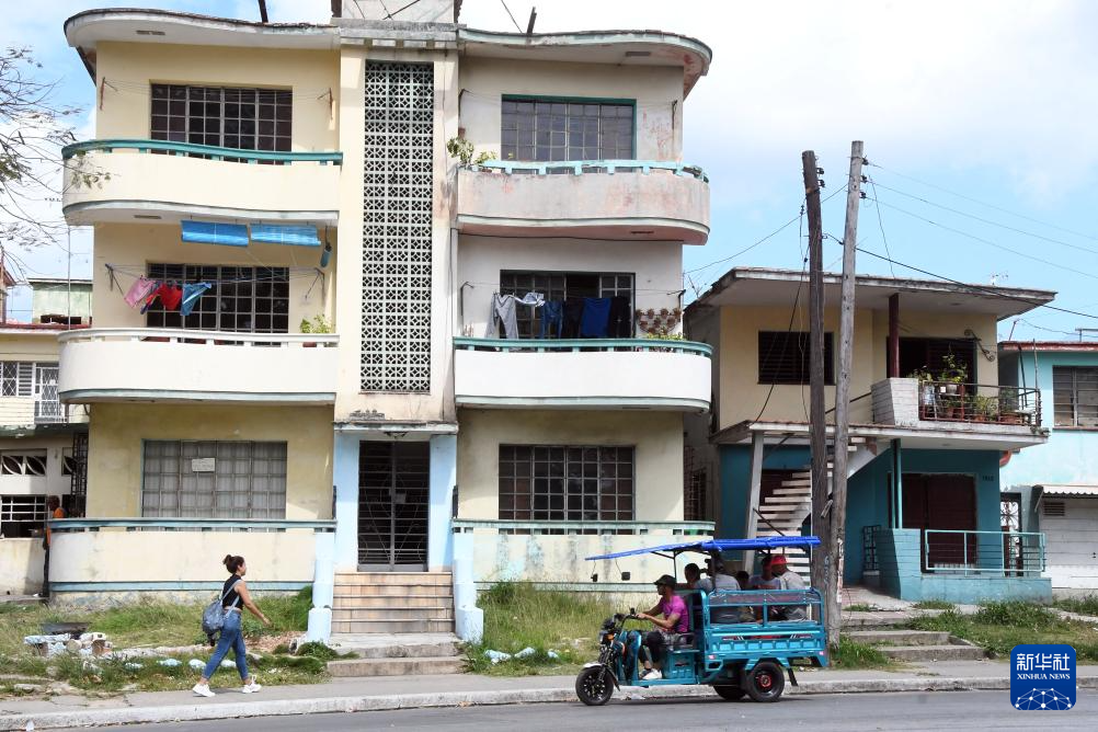 4月3日,在古巴首都哈瓦那,一辆载有乘客的电动三轮车驶过居民楼。新华社发(华金·埃尔南德斯摄)