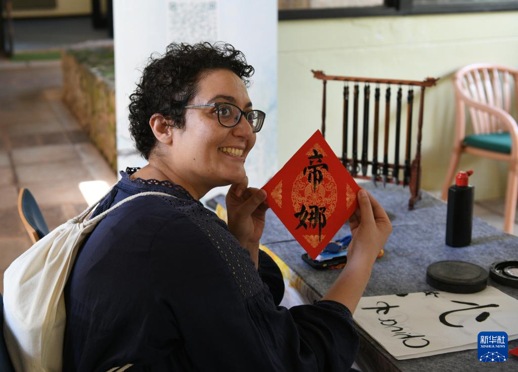 4月13日,在肯尼亚内罗毕,人们在联合国中文日文化体验活动现场体验书法拓印。 新华社记者 刘琼 摄