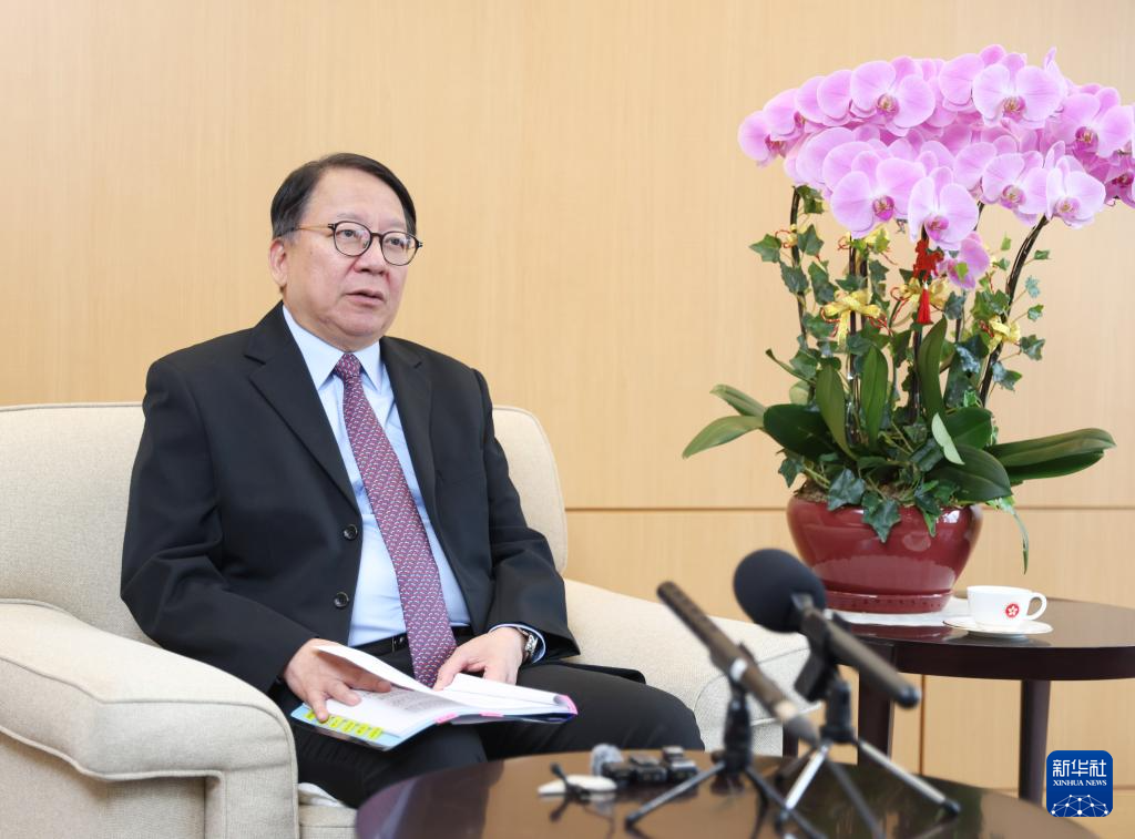 香港特别行政区政府政务司司长陈国基接受媒体联合采访(4月10日摄)。新华社记者 甄晓博 摄