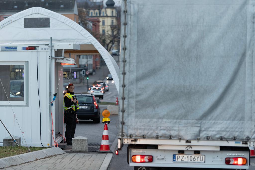 3月16日,在位于德国和波兰边境的德国城市奥德河畔法兰克福,警察在边境检查站执勤。新华社记者张豪夫摄