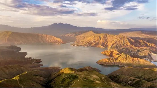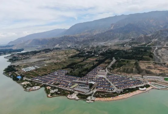 李家峡大坝横卧河谷、草木丰茂、珍禽翔集