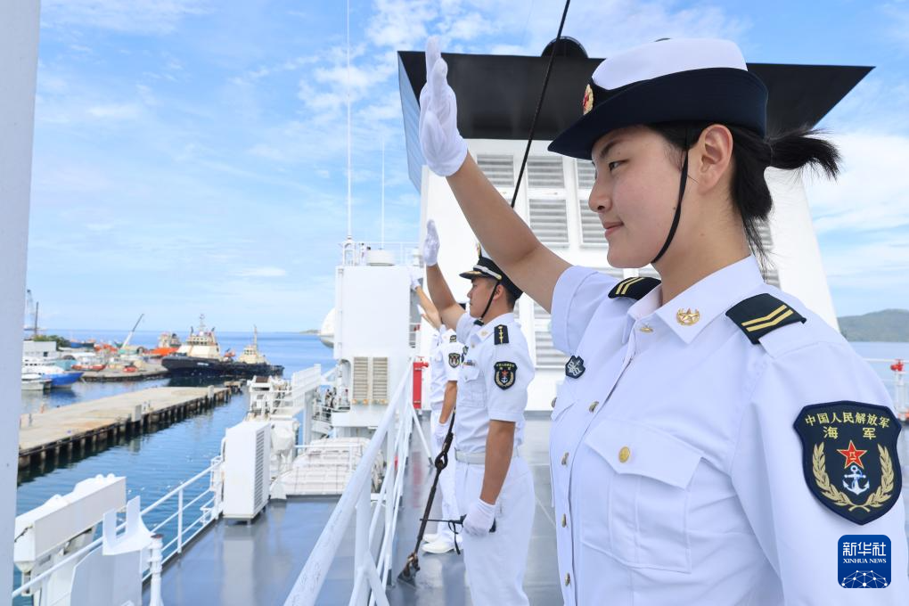 4月15日,执行“和谐使命-2025”任务的中国海军“丝路方舟”号医院船离开巴布亚新几内亚莫尔兹比港。这是码头欢送仪式。新华社发(崔晓洋摄)