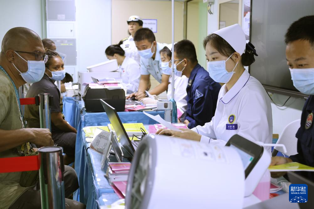 4月11日,执行“和谐使命-2025”任务的中国海军“丝路方舟”号医院船在巴布亚新几内亚开展医疗服务。这是医院船挂号处。新华社发(崔晓洋摄)