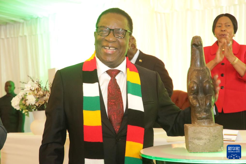 4月15日,在津巴布韦哈拉雷总统府,津巴布韦总统姆南加古瓦在交接仪式上展示回归的“津巴布韦鸟”石雕。新华社发(肖恩·朱萨摄)