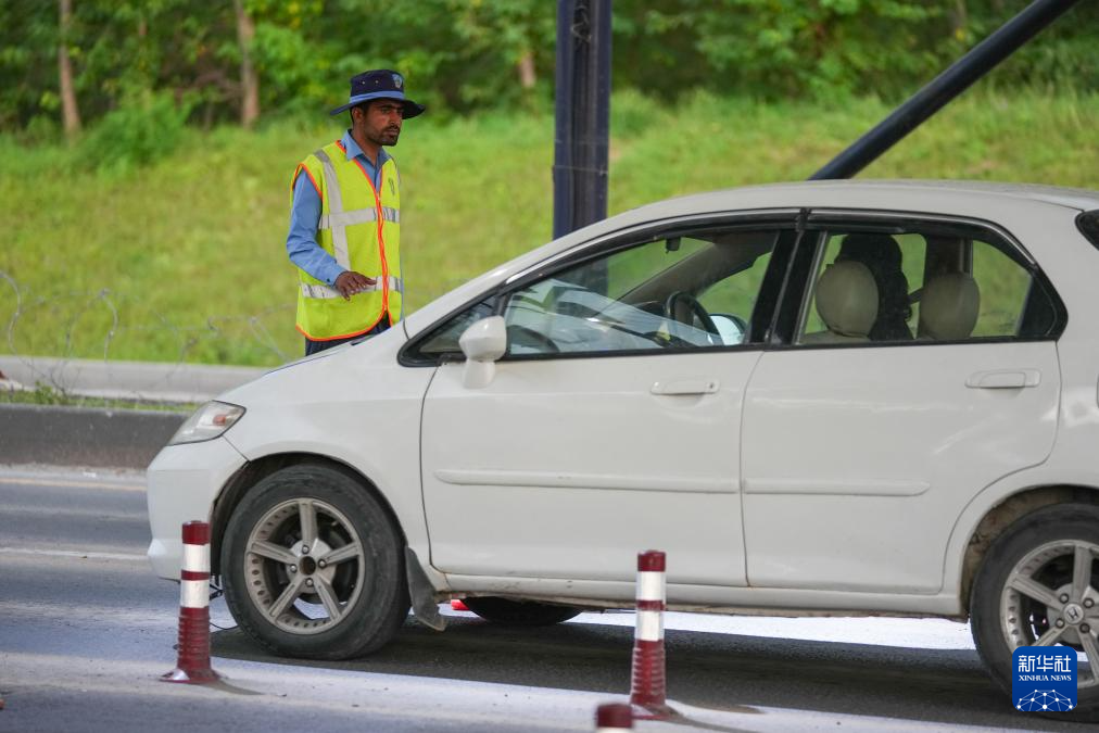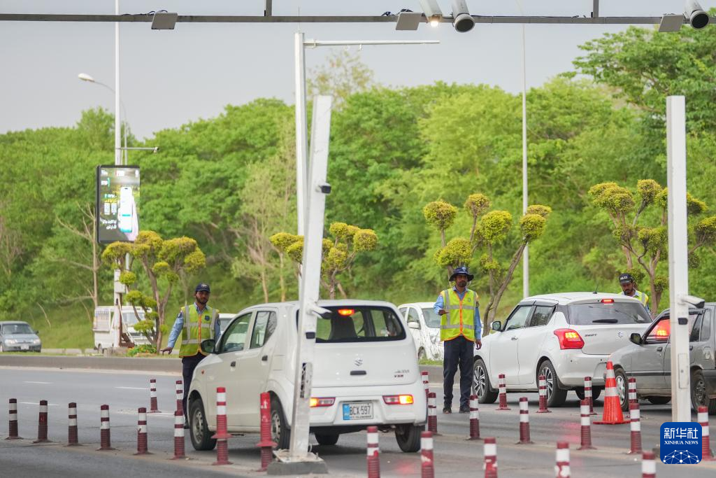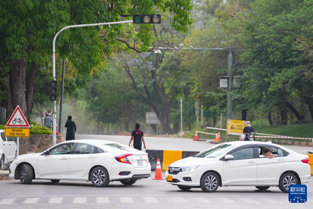 4月16日,在巴基斯坦首都伊斯兰堡,汽车从安全核心区附近设置的路障前绕行。新华社记者 陈泽国 摄
