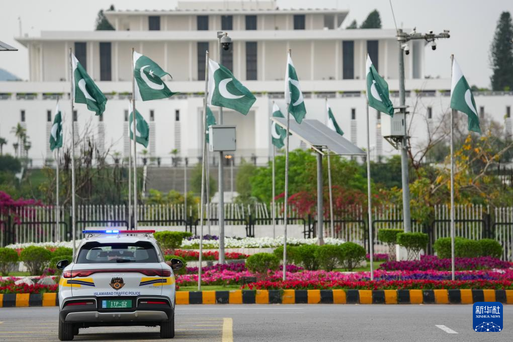 这是4月16日在巴基斯坦首都伊斯兰堡总统府前拍摄的警车。新华社记者 陈泽国 摄