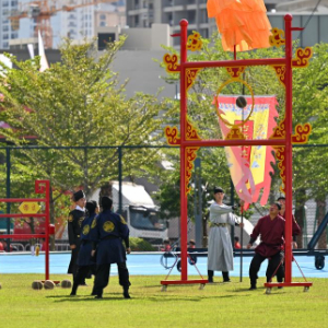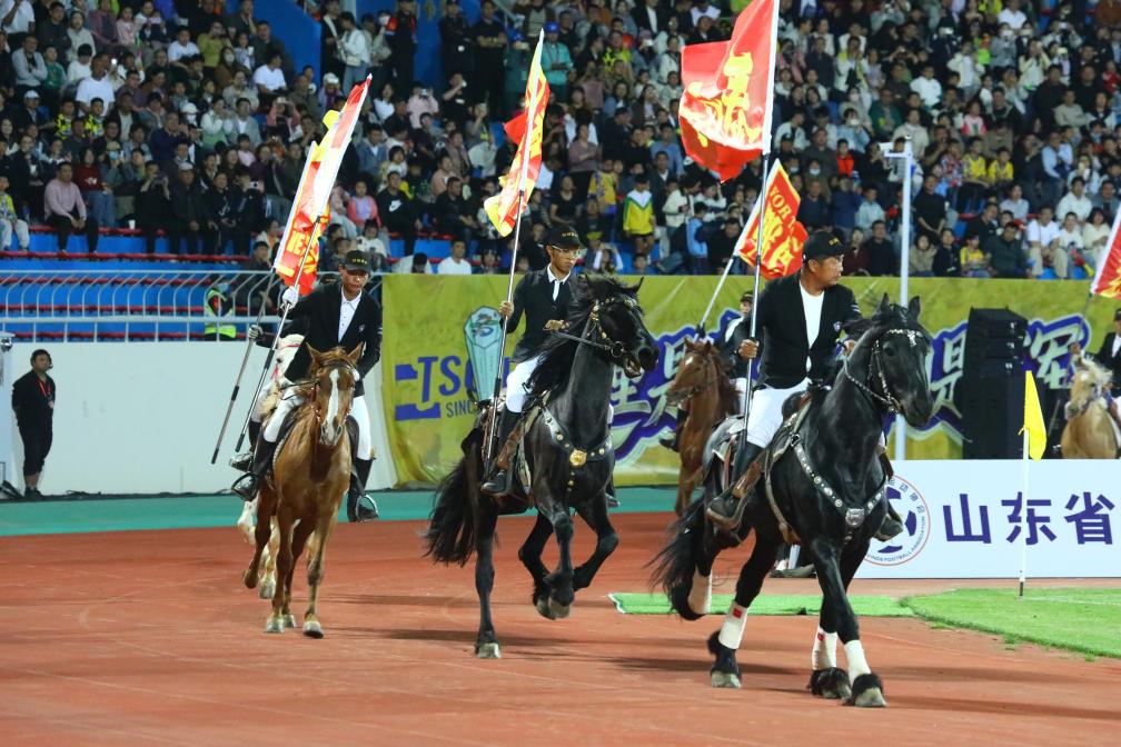 第十二届全国少数民族传统体育运动会期间,山东队选手表演《蹴鞠》。新华社记者 孙凡越 摄