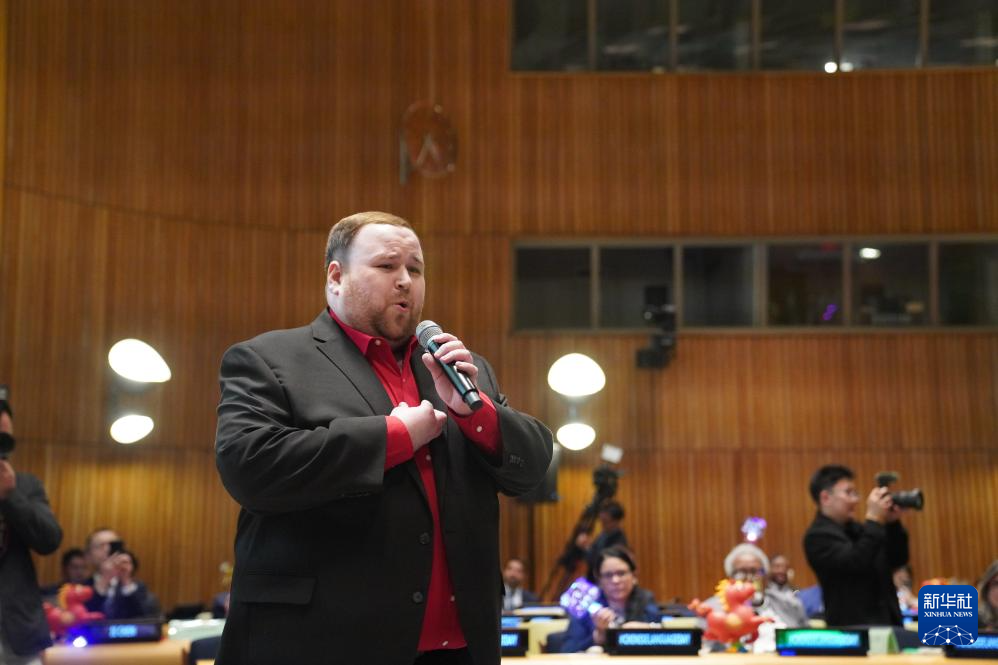 4月13日,在位于纽约的联合国总部,美国歌唱家在联合国中文日庆祝活动上演唱《我爱你中国》。 新华社记者 张凤国 摄