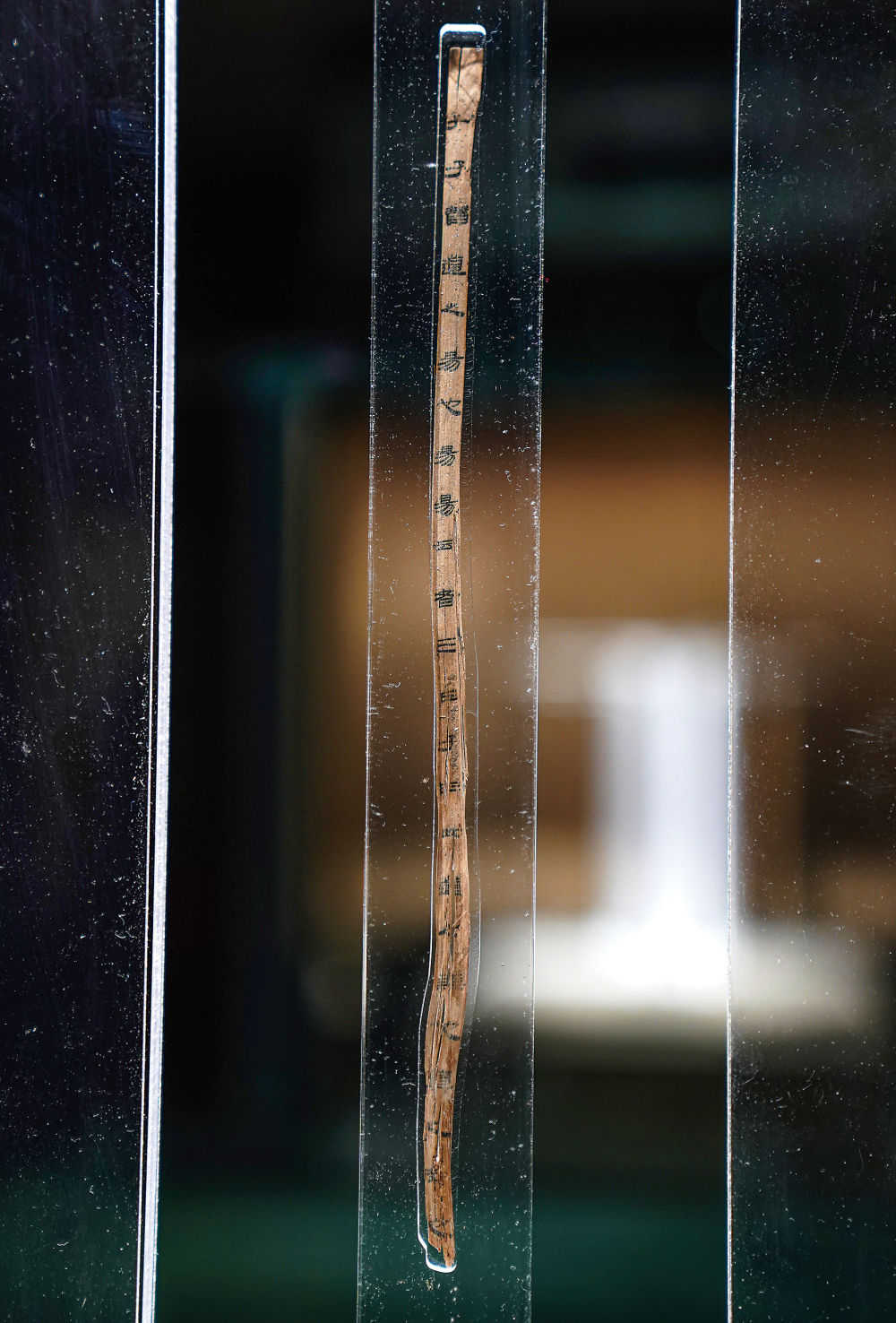 在江西南昌汉代海昏侯国遗址博物馆拍摄的齐《论语·智道》简,其上文字为“孔子智道之昜也昜昜云者三日子曰此道之美也莫之御也”(4月13日摄)。4月14日,南昌汉代海昏侯国遗址博物馆“书香海昏”展厅大规模上新,百余枚新修复完成的海昏简牍原件首次面向公众展出。其中,失传1800余年的齐《论语·智道》简上“孔子智道之昜也昜昜云者三日子曰此道之美也莫之御也”的简文,与齐《论语》特征接近,这一重大发现填补了《论语》版本流传史的空白。新华社记者万象摄