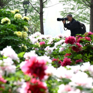 4月18日,摄影爱好者在河北省石家庄市植物园牡丹园拍照。新华社发(陈其保摄)