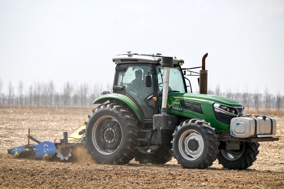 4月17日,在内蒙古通辽市科尔沁区敖力布皋镇,农机手驾驶拖拉机整地。新华社记者 连振 摄