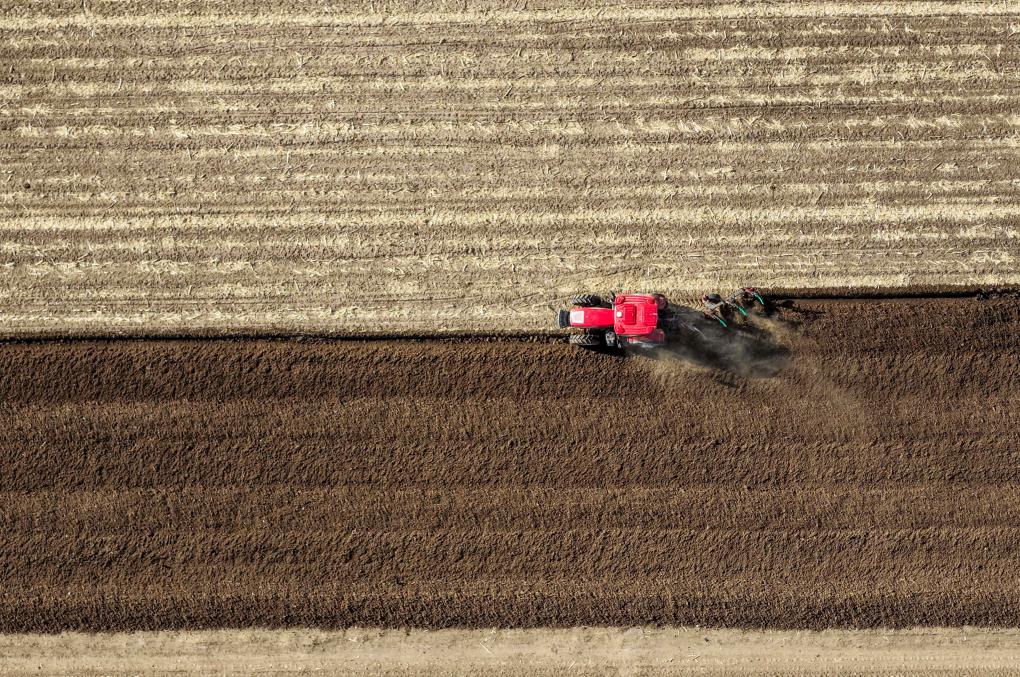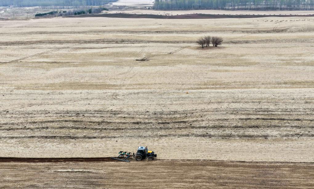 4月19日,在通辽市科尔沁左翼后旗甘旗卡镇,农机手驾驶农机翻地(无人机照片)。新华社记者 连振 摄
