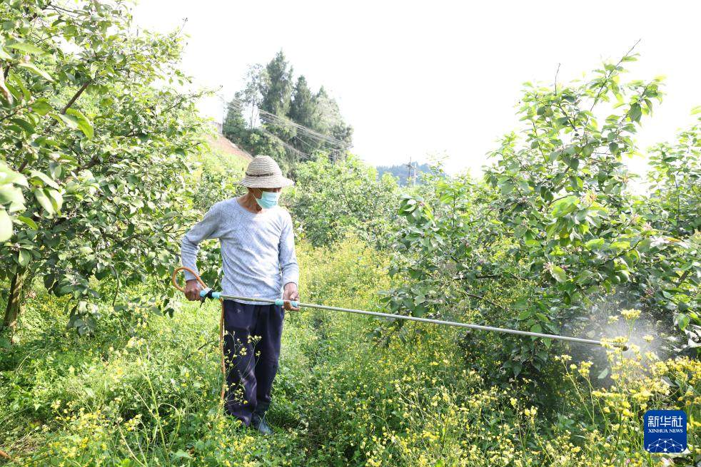 4月10日,在四川省资阳市安岳县永顺镇太阳村柠檬种植基地,农户进行防控作业。新华社发(闫凯 摄)