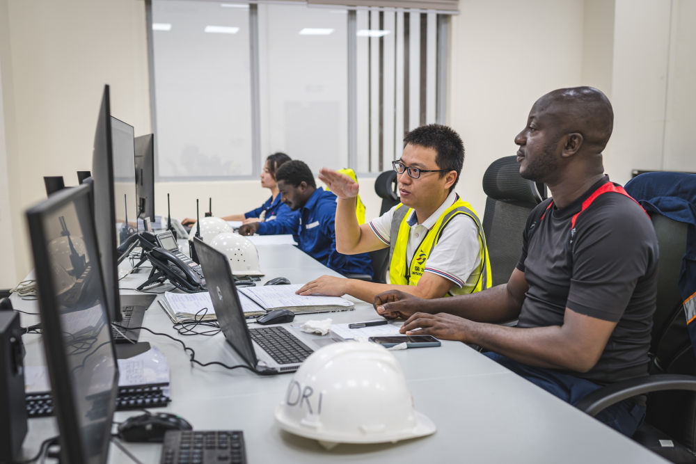 2025年5月29日,中国电力建设集团有限公司波波里水电站总工程师后兵(右二)与当地技术人员在位于科特迪瓦苏布雷的格西波-波波里水电站进行日常监控工作。据后兵介绍,该水电站建设期间共提供约2000个直接就业岗位,间接带动近千人就业。水电站项目为当地工人提供了成长平台,“他们不仅将工程技术传下去,也传承着经验和信任,架起中科友谊的桥梁”。